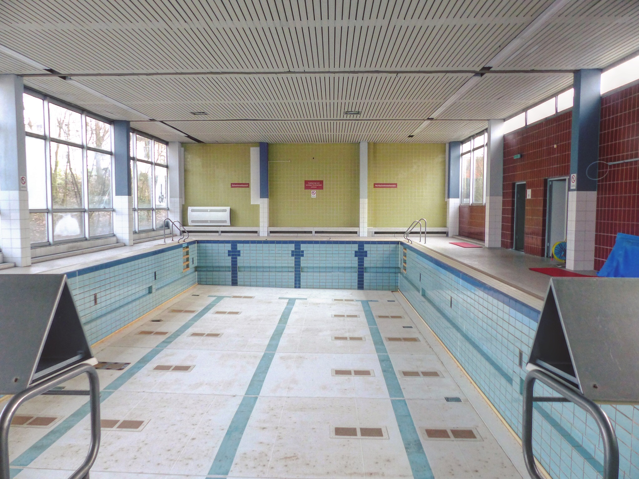 40 Jahre hat die Halle auf dem Buckel und die letzten 25 Jahre waren geprägt von unzähligen Schließtagen wegen mannigfaltiger Reparaturen. Bei einem Rundgang durch die technischen Anlagen unterhalb des Beckens belegen Material- und Farbunterschiede der Leitungen, Rohre und Muffen verschiedene Epochen von Flickschusterei und Improvisation. Salzausblühungen und Salzkrusten in diversen Längen bezeugen langjährige Durchfeuchtungen der Baustoffe durch Wasserverlust im Becken.
