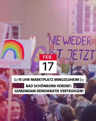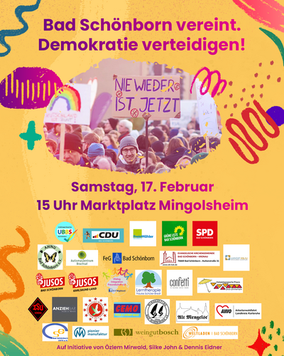 Das gab es noch nie: Organisationen, Vereine und Betriebe aus allen Bereichen sind dabei. Gemeinsam mit über 25 Organisationen rufen wir am Samstag dazu auf, bei der Kundgebung „Bad Schönborn vereint. Gemeinsam Demokratie verteidigen." Haltung zu zeigen. Auf dem Marktplatz möchten wir ein starkes Signal für unsere Demokratie und Vielfalt setzen und deutlich machen, dass hier bei uns – in Bad Schönborn – kein Platz für Rassismus und Hetze ist.