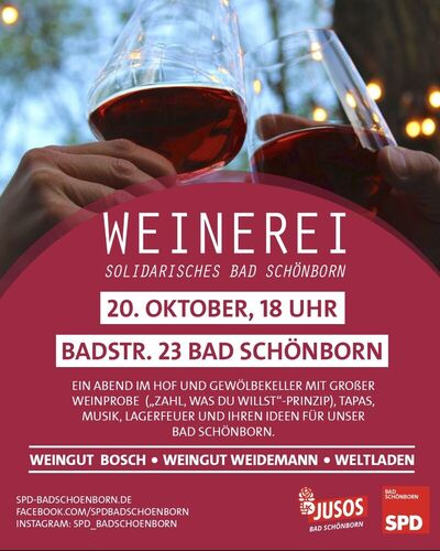 Am 20. Oktober um 18 Uhr öffnen Jusos und SPD Bad Schönborn wieder die Weinerei im Hof und Gewölbekeller in der Badstraße 23.