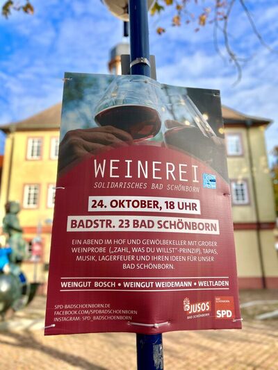 Am 24. Oktober um 18 Uhr öffnen Jusos und SPD Bad Schönborn wieder die Weinerei im Hof und Gewölbekeller in der Badstraße 23. Gemeinsam mit den lokalen Weinhändler*innen wurden die besten Weine Bad Schönborns zusammengestellt. Unter anderem können Weine vom Weingut Weidemann, Weltladen und Weingut Bosch probiert werden. Sie erwartet eine große Vielfalt unseres Kulturguts.